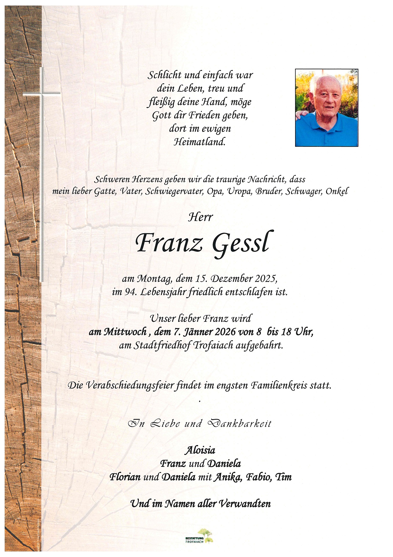 Tief berührt sprechen wir euch unsere aufrichtige Anteilnahme aus. In dieser schweren Zeit des Abschiednehmens sind wir mit unseren Herzen und unseren Gedanken bei Euch. Wir sind unendlich traurig über den Tod von Franz und fühlen uns in dieser schweren Zeit eng verbunden.